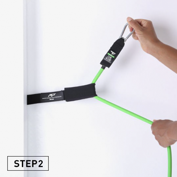 - Simply slide your PTP Elite Door Anchor through the hinge side of your door (for safety) and tread your Power Tube through the loop end to perform your workouts