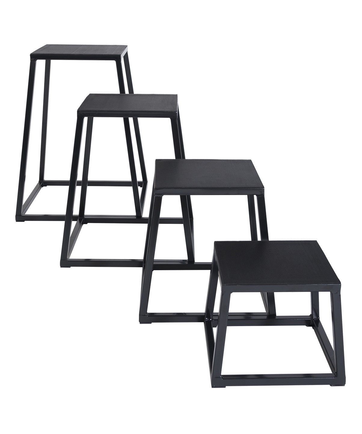 Strong and sturdy this stunning set of 4 stackable boxes which come in the following height; 12”, 18”, 24” and 30” with maximum stability and steel construction with fully welded frames. 3/4" plywood landing pad with a 1/8" non-skid slip resistant rubber surface for increased grip.