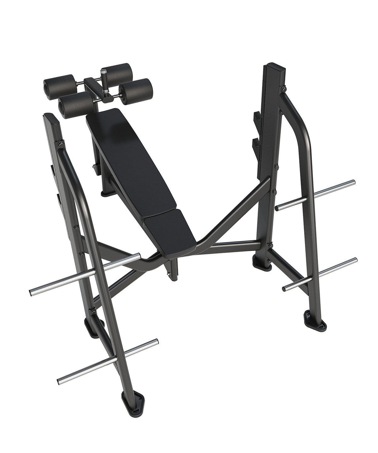 The Prestige Olympic Decline Bench allows users to perform decline press without excessive external rotation of the shoulders. The fixed angle of the seat pad provides correct positioning, and the adjustable leg roller pad ensure maximum adaptability for users of different sizes.