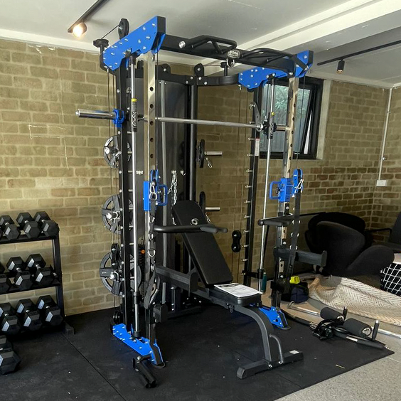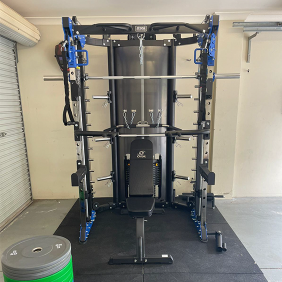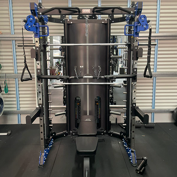 Equipped with solid steel diamond cut, machined knurling on bar for for a firm grip and 12 catch positions, the Smith Machine features ultra smooth barbell travel with a safe and secure locking mechanism. The Olympic bar on the Smith Machine comes with two blue weight plate clamp locks and is rated to 400kg, counter weighted by the weight stack.