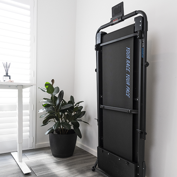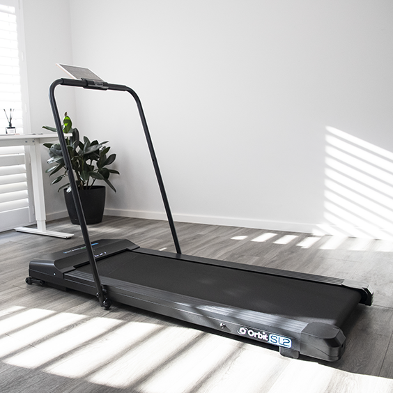 This compact standing desk treadmill will fit perfectly into a small apartment or home office and can be stored upright or under the bed. Featuring a removable handrail, the SL2 treadmill can be used under a desk so you can reach your step goal while you work!