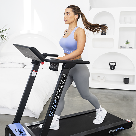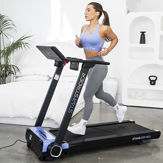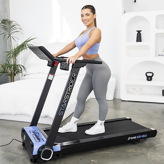 The hassle free SS450 StarStrider Treadmill has a 1.5HP DC brushless motor, Bluetooth speakers, folds completely flat for under bed or upright storage and comes pre-assembled.